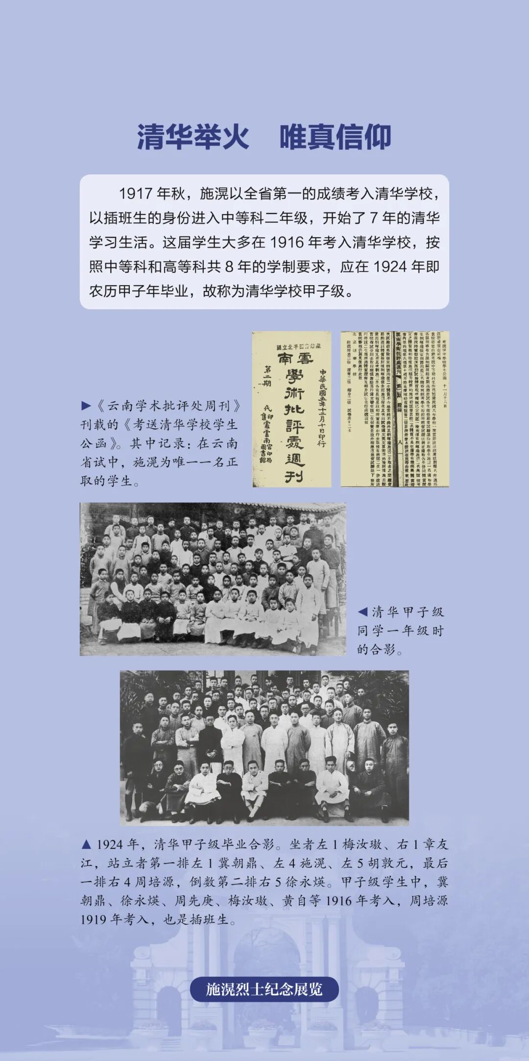 为进一步缅怀革命先烈、弘扬革命精神,传播红色文化、赓续红色血脉,9月30日,由清华大学校史馆、档案馆,中共大理州委党史研究室,中共洱源县委、县人民政府,大理州博物馆联合举办的“真理所在,即趋附之——施滉清华毕业一百周年纪念展”在大理州博物馆开展。