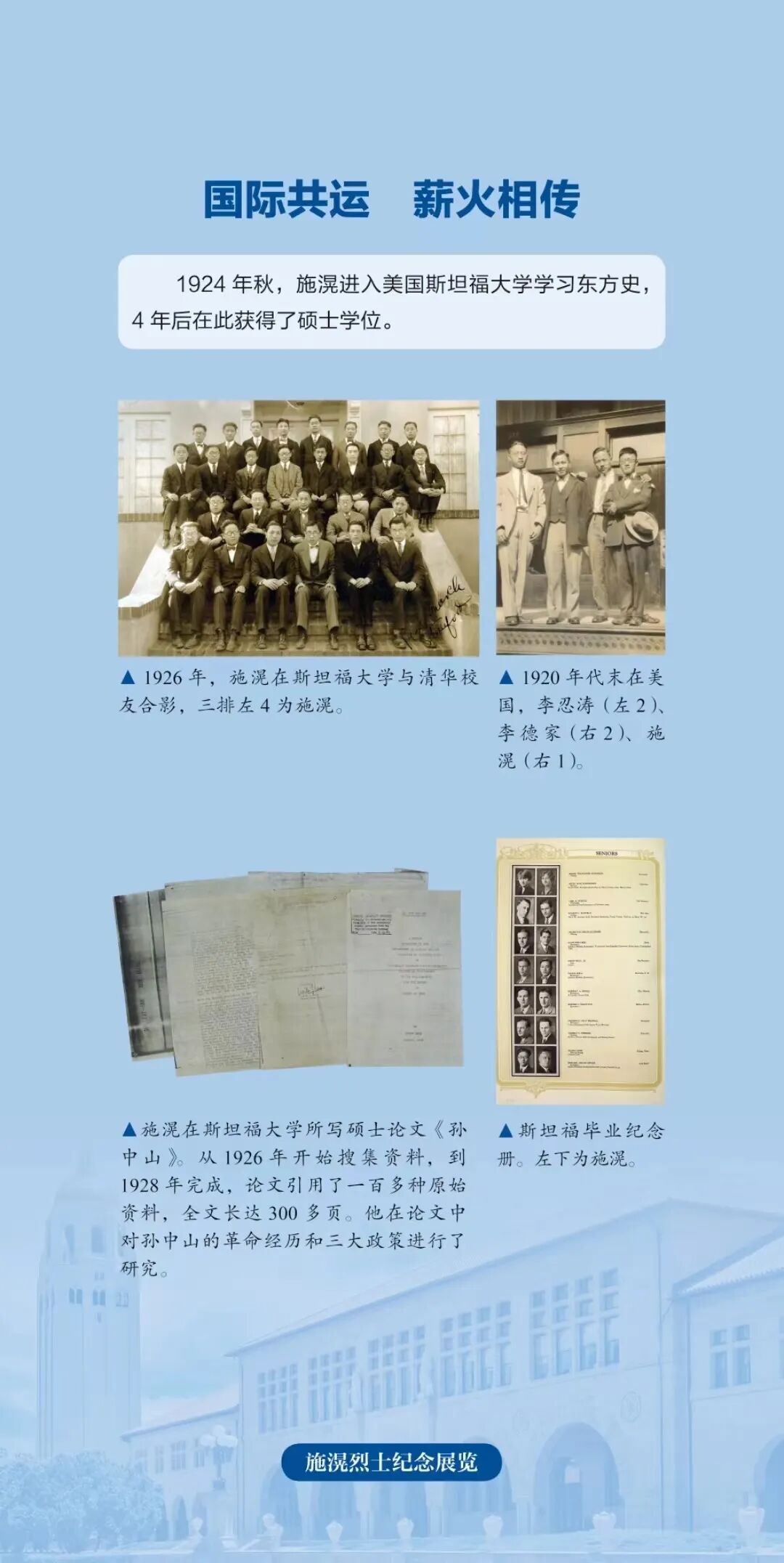 1924年7月,施滉到美国斯坦福大学留学,在旧金山旅美华侨和中国留学生中成立进步组织,开展革命活动,声援国内革命斗争。1927年初,他加入美国共产党,当选为美共中央中国局首任书记,是清华第一位中共党员,被誉为“清华大学最有光荣的儿子”。“中国工农阶级与旅美华侨大联盟”由施滉等人在美共的指引下创立,《国民日报》也由施滉等人筹备。他还陆续在加拿大、美国、古巴等国组织“反帝大同盟”活动。为了纪念施滉,美国共产党把每年的1月1日定为施滉纪念日。