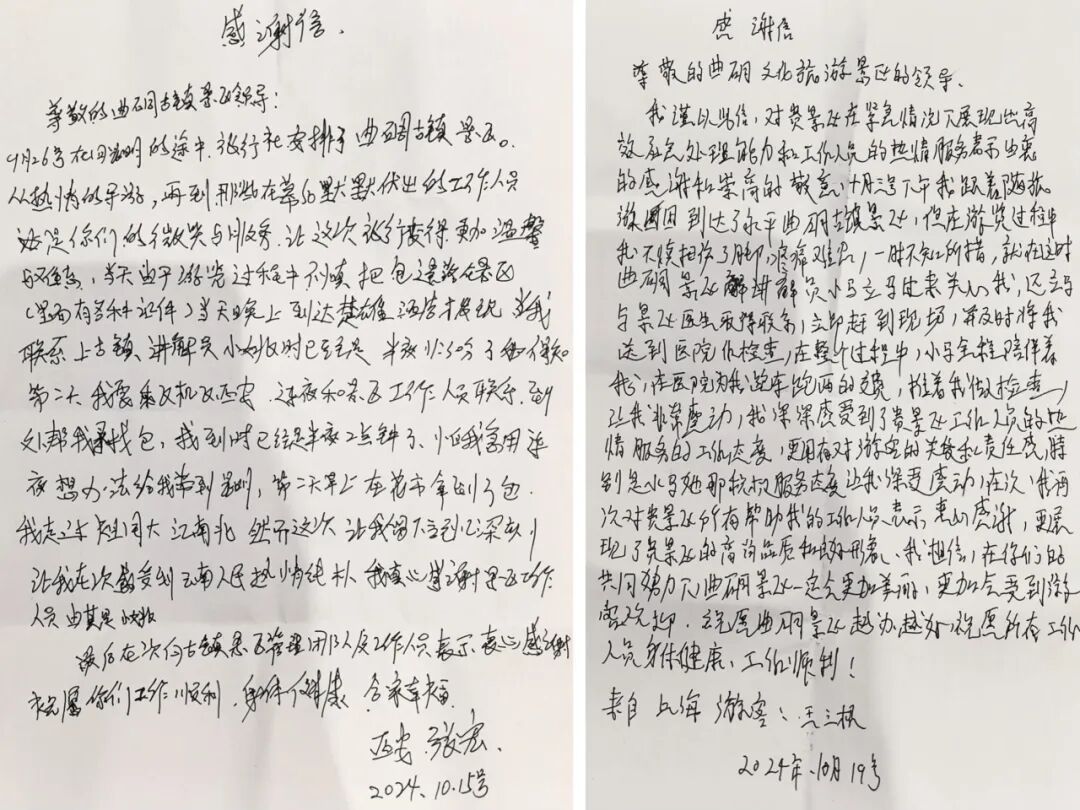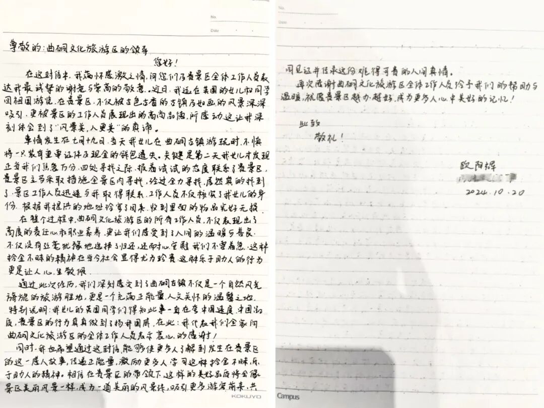 事后,这名游客的母亲写了一封感谢信,夸赞永平曲硐文化旅游区不仅是一个风光旖旎的旅游胜地,更是充满正能量和人文关怀的温馨之地。信中,提到她女儿的英国同学知道此事后纷纷称赞“中国品质、中国速度”,还希望能够通过这封信的记录,让更多人了解景区乐于助人、拾金不昧的感人故事,从而吸引更多游客前来旅游观光。
