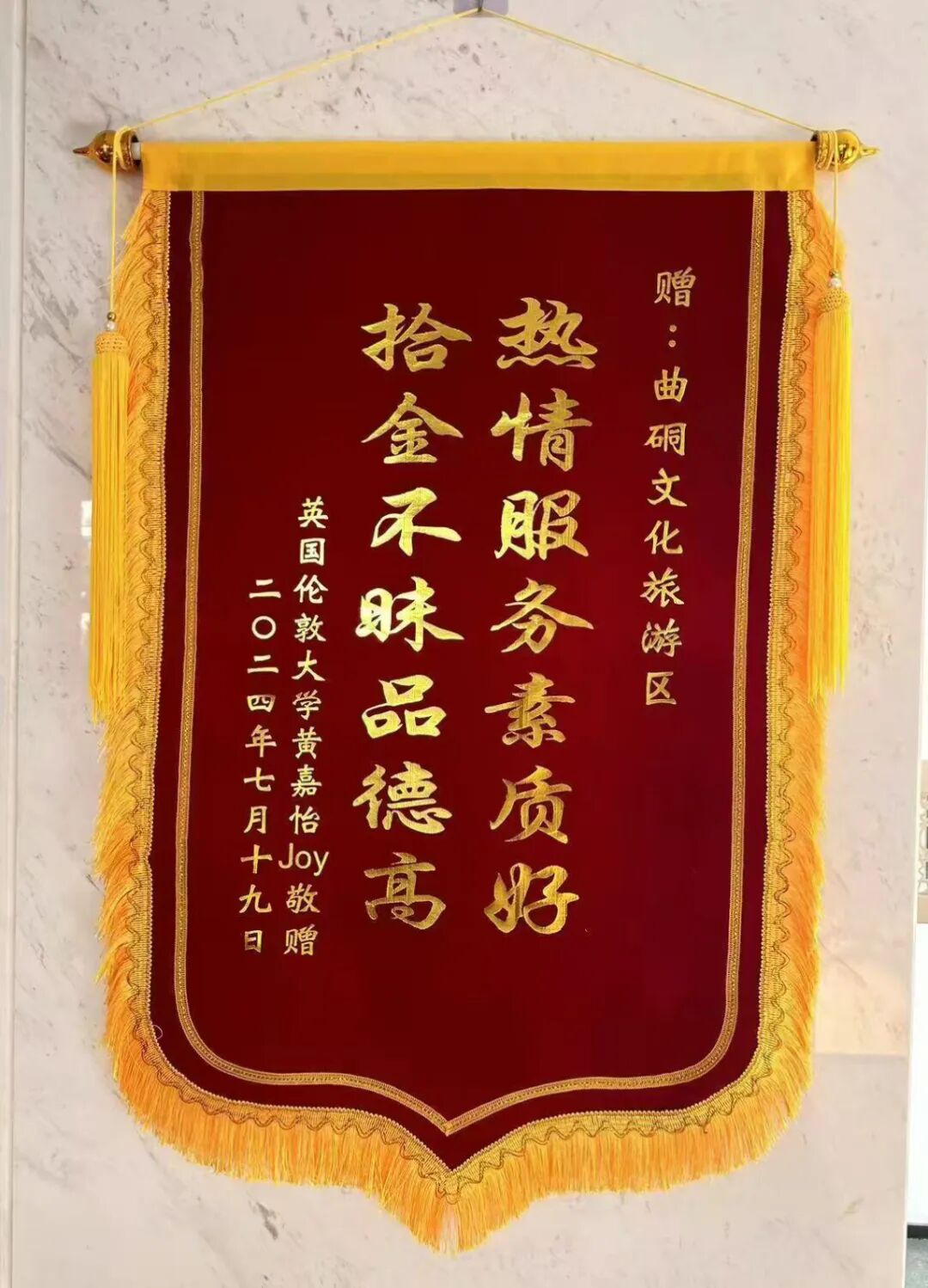 永平曲硐文化旅游区还收到了一面特殊的锦旗,之所以说特殊,是因为这面锦旗来自一位英籍华人游客。她在景区游玩过程中,钱包不慎丢失,景区工作人员得知后立马在全景区寻找并及时把钱包寄还游客。找回钱包后,游客对景区工作人员高度的责任心和拾金不昧的精神大为赞赏,并赠予“热情服务素质好,拾金不昧品德高”锦旗一面。