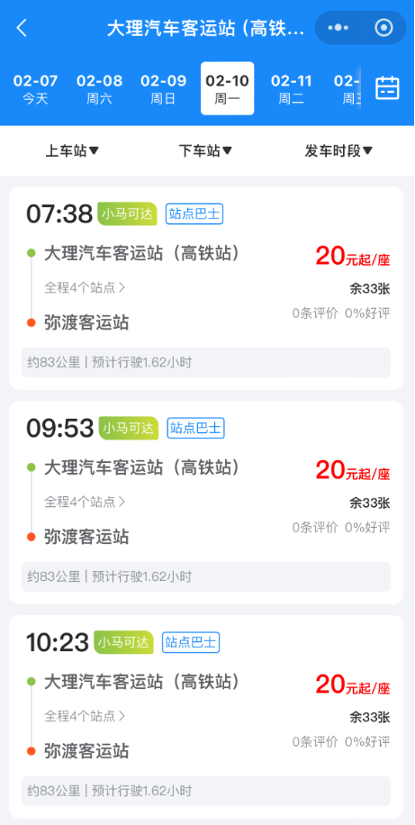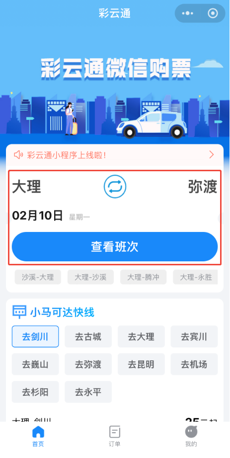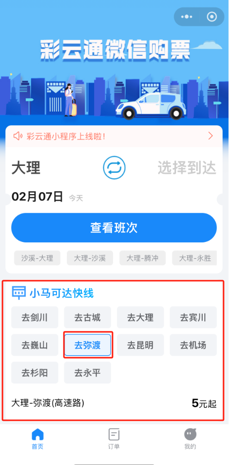 “大理-弥渡”线路开通了线上双平台便捷购票,乘客可通过彩云通”微信小程序或“大理交运”抖音小程序,简单几步操作,就能买到您心仪的车票。