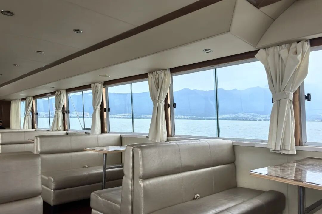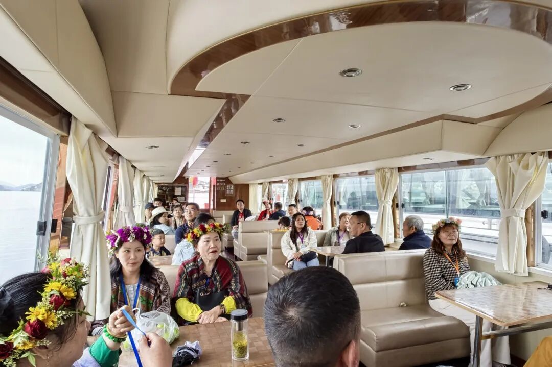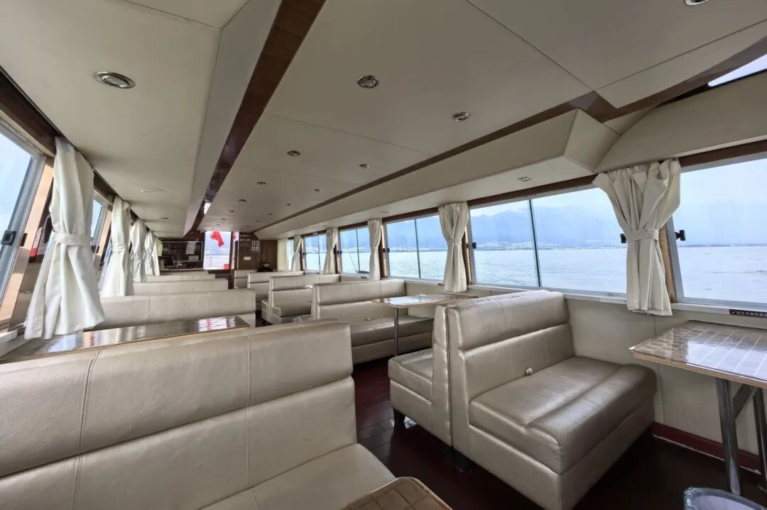 登船后,可看到水上公交船舱内宽敞洁净,舒适自然的氛围吸引着不少游客在船舱内便开始拍照留念,一览苍洱风景。