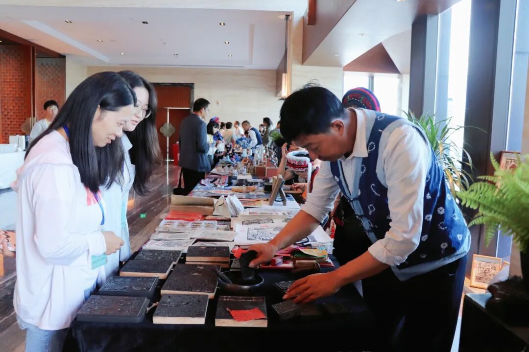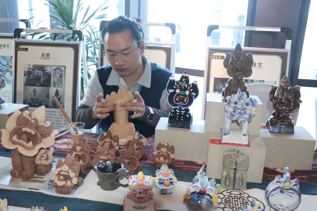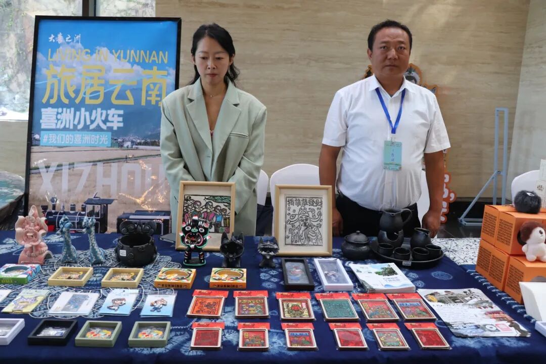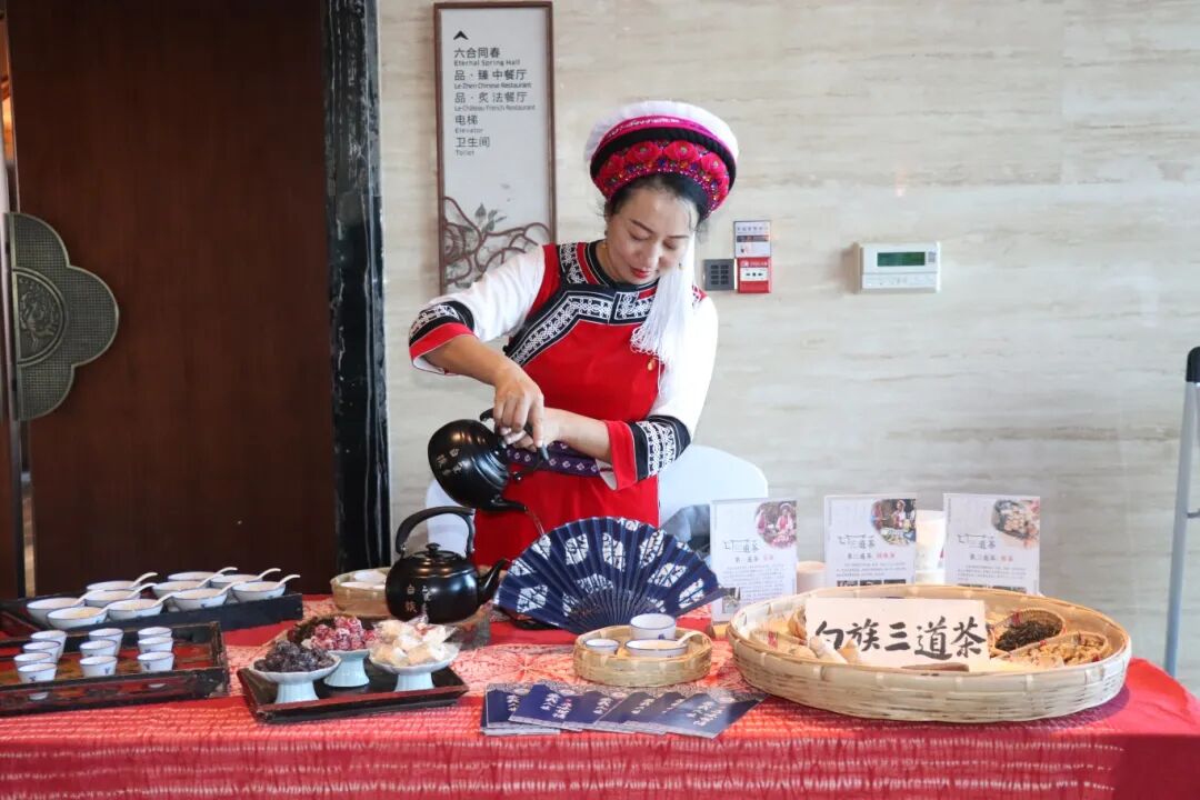 会场外,白族三道茶香气四溢,诺邓火腿酥咸香酥软……吸引现场的嘉宾前来品尝大理味道。白族甲马、白族刺绣、瓦猫、鹤庆银器、白族扎染等琳琅满目的文创产品纷纷亮相,让现场观众沉浸其间,了解大理旅游资源,尽享非遗盛宴,在大理爱上生活。