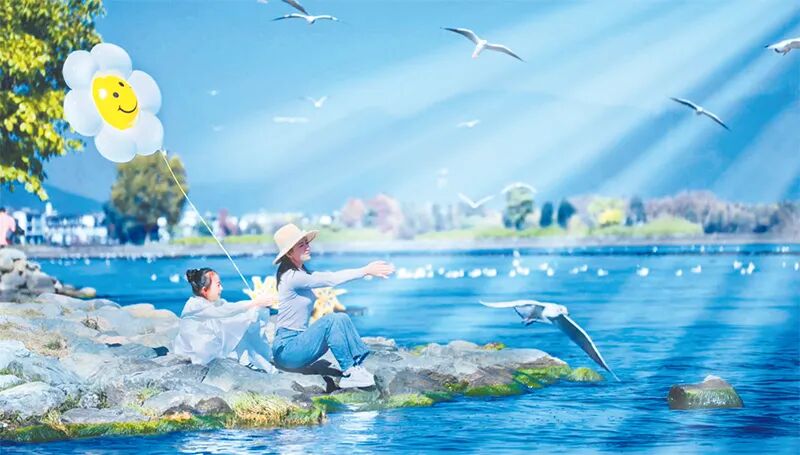 近年来,云南省加强洱海全流域生态保护治理,建成129公里生态廊道,提供了“水清、岸绿、景美”的亲水空间。图为2024年11月8日,游客在洱海边与海鸥亲密互动。 大理州洱海管理局 供图