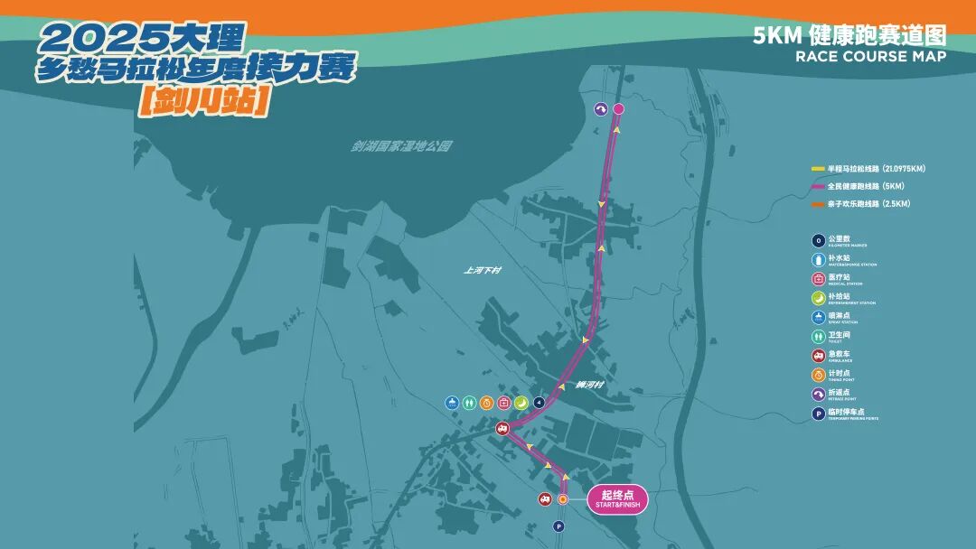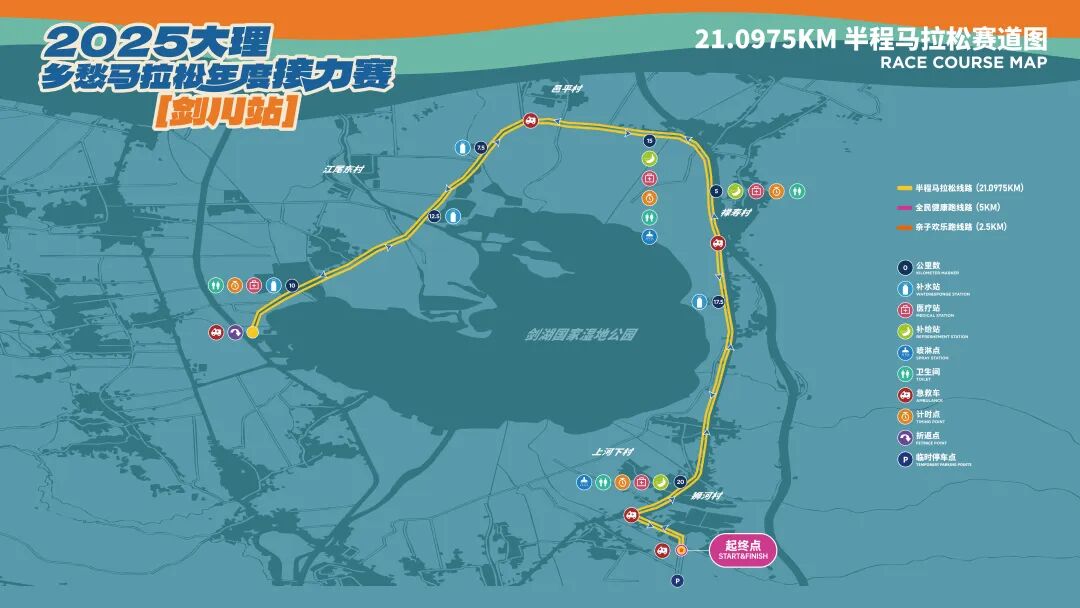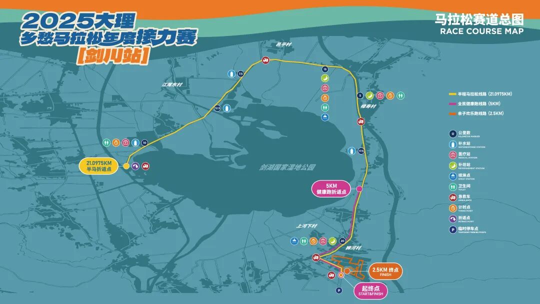 赛道描述:起点·剑川木雕艺术小镇---进入剑湖环湖线沿逆时针方向行进---环湖线2.5公里折返点---剑川木雕艺术小镇·终点;