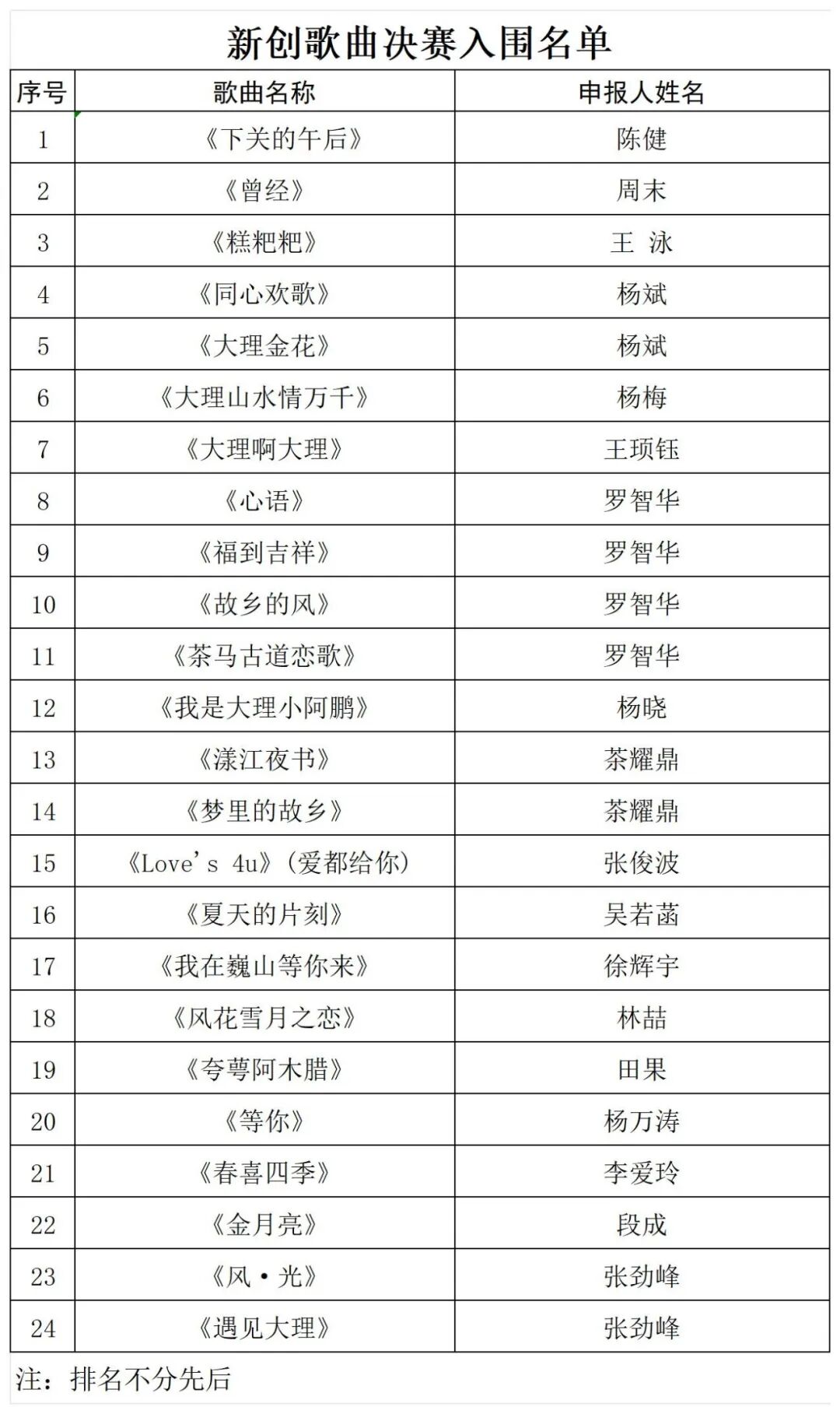 初赛环节,评委通过选手线上报送的视频进行评审,最终评出2025大理情歌会•第十九届洱海歌手大奖赛决赛入围歌手(作品)。各组别决赛入围名单如下: