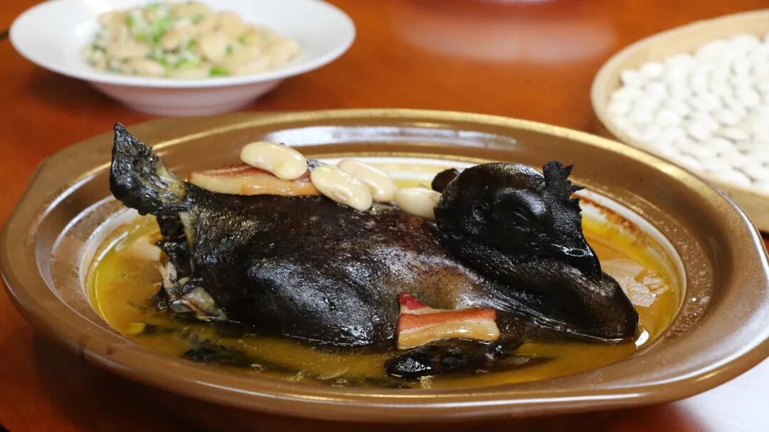 土鸡整只抹匀蜂蜜入锅慢炖,待肉质炖至软烂脱骨,加入焖软的白芸豆一同收汁。鸡肉煮熟后将其撕开,鸡肉紧实不柴,芸豆吸饱肉香与蜜香,咸甜交织,是大理人家待客的暖心硬菜。