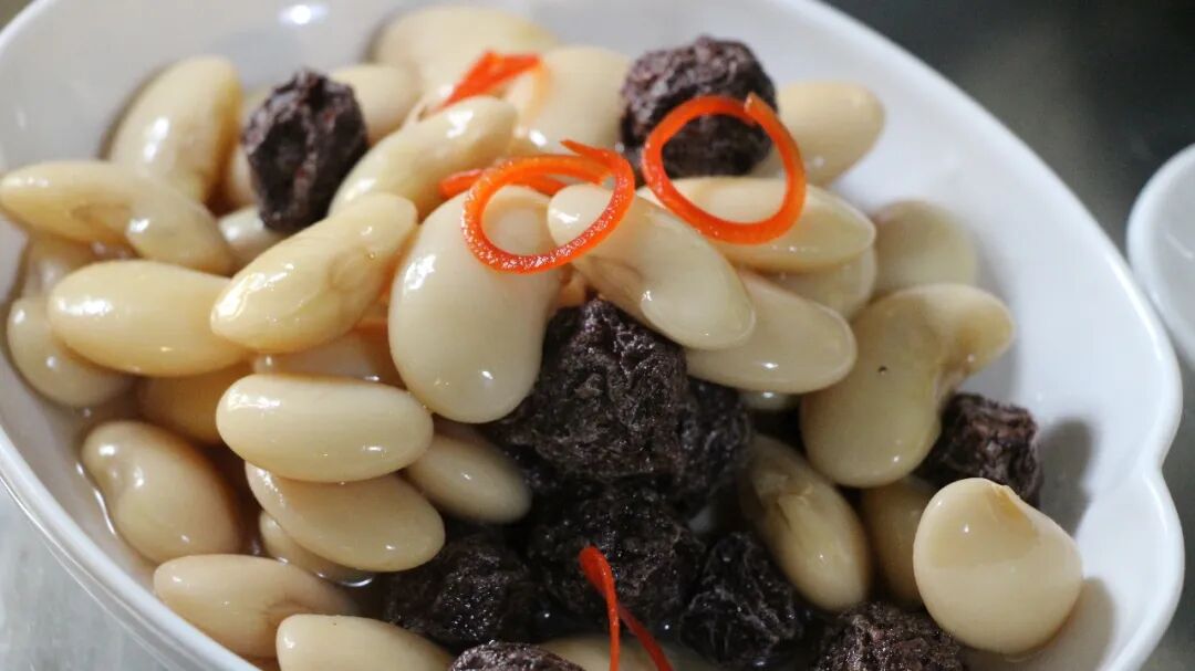 白芸豆煮至绵密,加入话梅与冰糖慢炖,让梅子的酸香充分浸入豆中,酸甜解腻,是一道酸甜爽口的开胃小食。