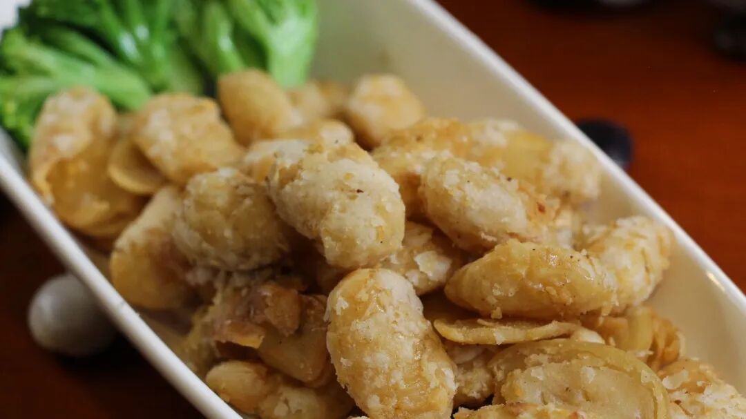 白芸豆提前泡软,先裹一层薄淀粉,再均匀裹上咸蛋黄液,下锅炸至金黄酥脆。外皮焦香扑鼻,内里绵软细腻,撒上椒盐或辣椒粉,可以作为追剧、闲聊时的解馋小零食。