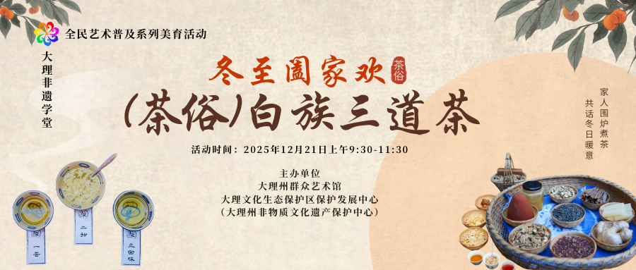 这个冬至,我们特别推出“冬至阖家欢”(茶俗)白族三道茶非遗技艺体验活动,邀您携家人围坐煮茶,在 “苦、甜、回味”的茶汤里,品节气之韵,话团圆之暖,共度一场有温度的非遗时光!