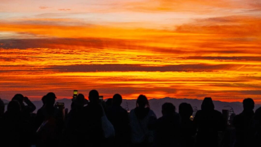 登山者在元旦清晨,于金顶寺前,沐浴晨光,齐许新愿,开启崭新之年。