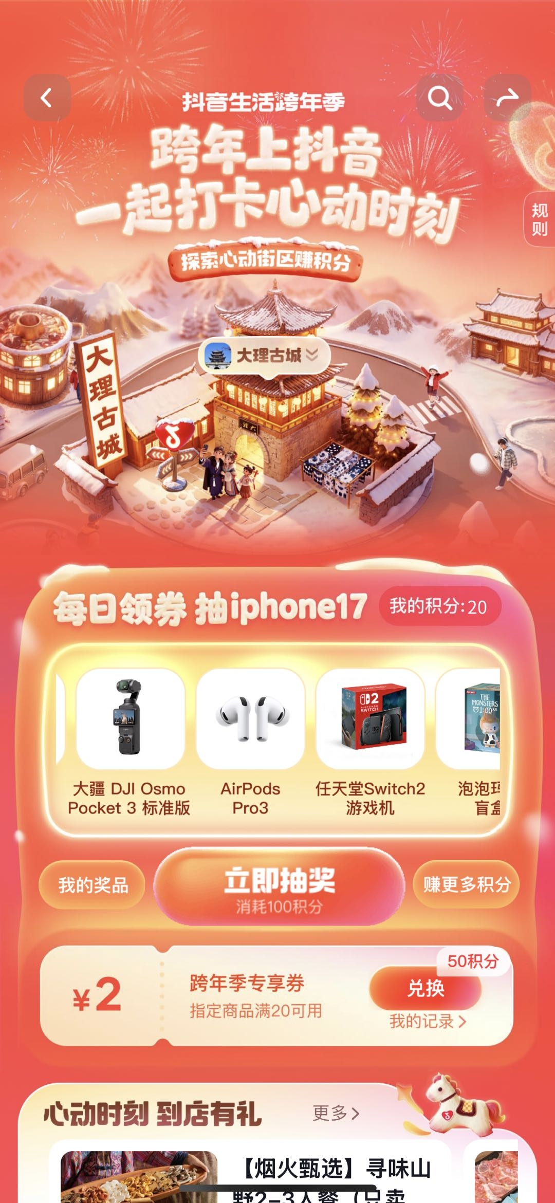 抖音平台进入「抖音生活跨年季」主会场,完成任务解锁积分,跨年好礼天天抽不停!抖音搜索“心动大理古城”、“跨年季大理古城”,“大理古城红包”即刻到手,一站式满足在大理古城跨年的消费需求,还有超多商圈优惠等你解锁。