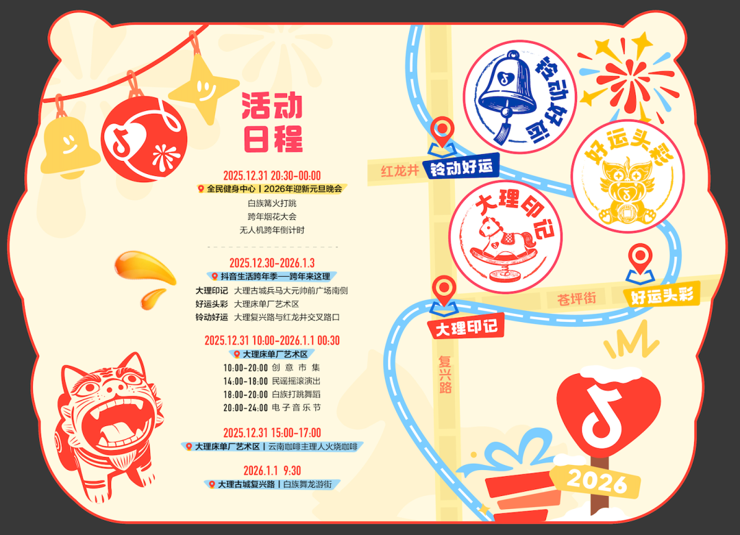 谁懂大理古城跨年的含金量,在甲马许愿打卡,新年马上如愿;在铃动好运许愿,新年鸿运当头;在瓦猫见证下,新年奔个好彩头。本次「抖音生活跨年季」深入大理古城商圈,在红龙井、复兴集市和床单艺术区,一起在古城里,将历史底蕴与潮流活力无缝融合。