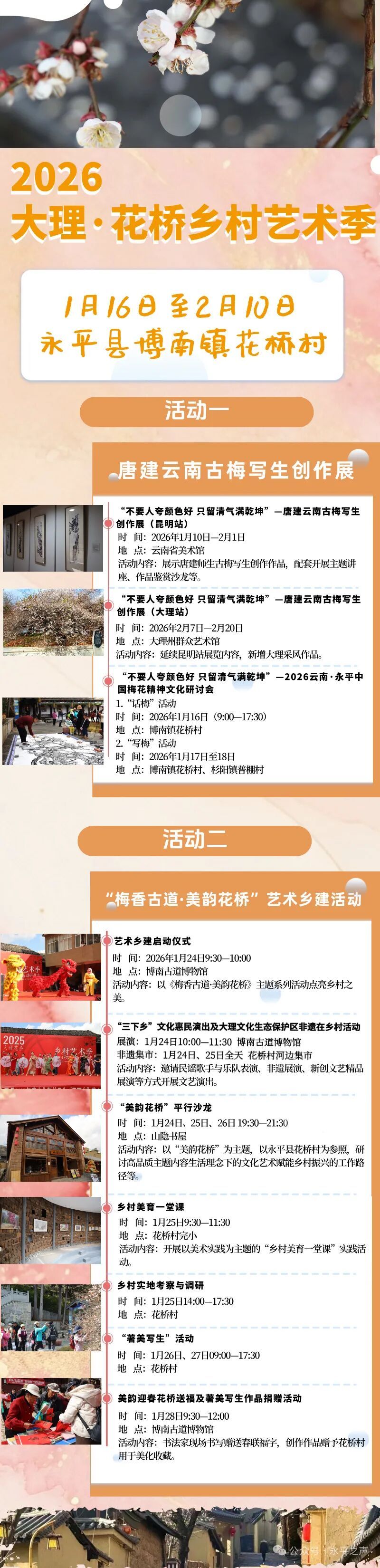 千年古道梅香漫,艺术乡建韵自来。2026年1月16日至2月10日,“2026大理·花桥乡村艺术季”将于永平县博南镇花桥村诗意绽放。以梅为媒,以艺为桥,我们诚邀您共赴一场融合古梅风骨、书画雅集、美育实践与乡建对话的山水人文盛宴。