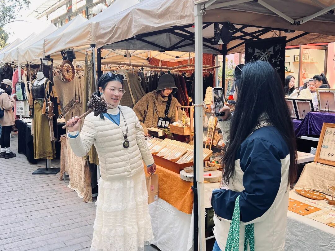 创业市集上,80余位入驻床单厂的手作达人、创意设计师集中展示销售手工制香、非遗服饰、原创画作等产品。
